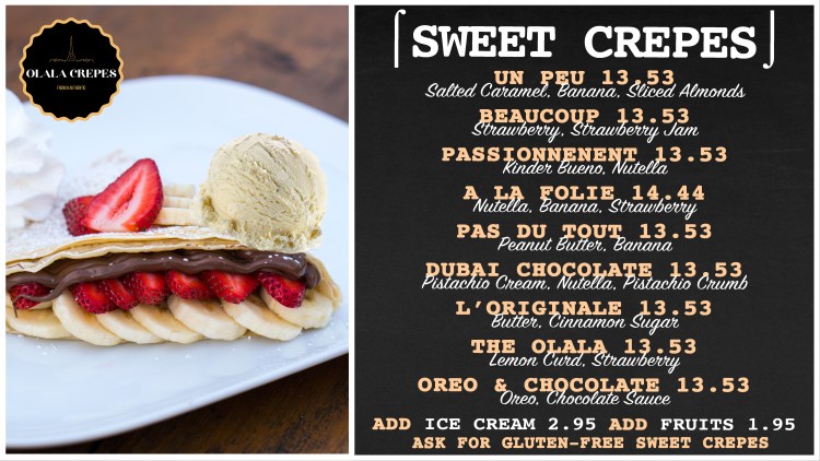 Olala crepes is an innovative French Creperie concept offering Legendary Sweet and Savory Crepes along with Luxury French Macaron and Desserts.